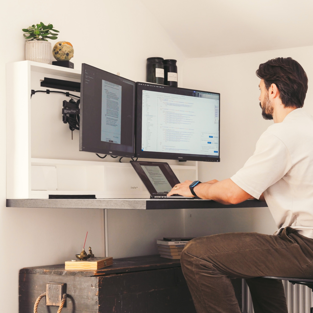 The DropTop™ Wall-Mounted Desk is crafted from high-density, premium-quality particleboard made using a mix of recycled wood from the forestry industry. Sustainability is at the heart of Pith & Stem’s products, the boards are locally sourced to reduce CO₂ emissions, FSC and PEFC certified, and designed to leave a minimal environmental footprint.