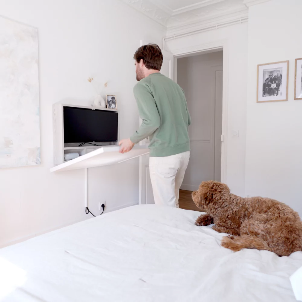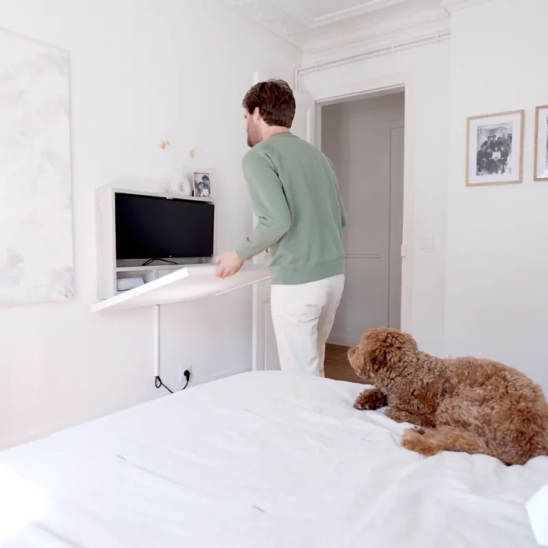 The DropTop™ office desk's design is the perfect blend of practicality and minimalist beauty. It stands as a unique solution in a market crowded with conventional desks, offering a wall-mounted, space-saving design that doesn't compromise on functionality. Its ability to fold away transforms any room into a multifunctional space, perfect for the home where every inch is precious.