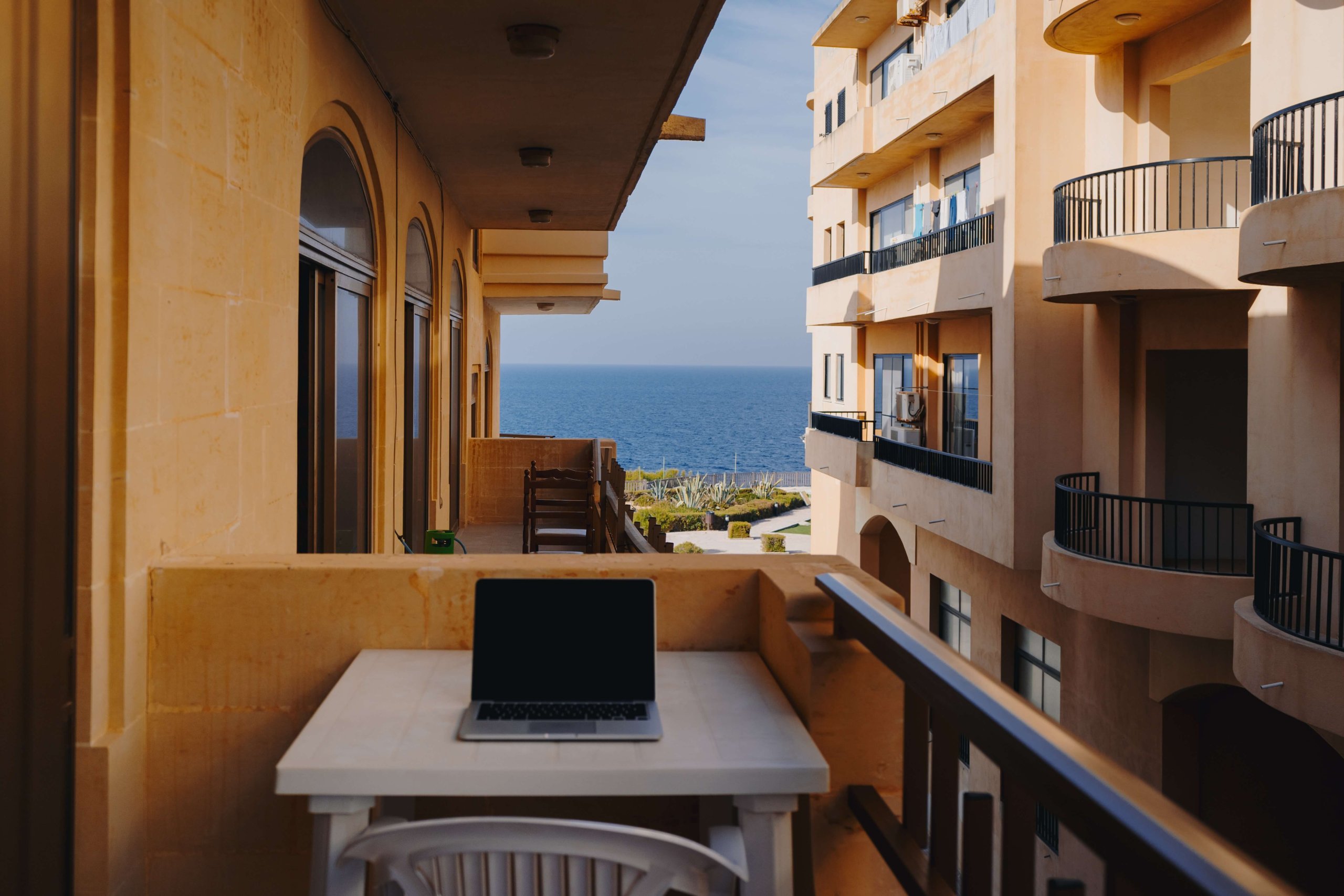 Photo of a laptop on a table on a balcony that overlooks the sea.