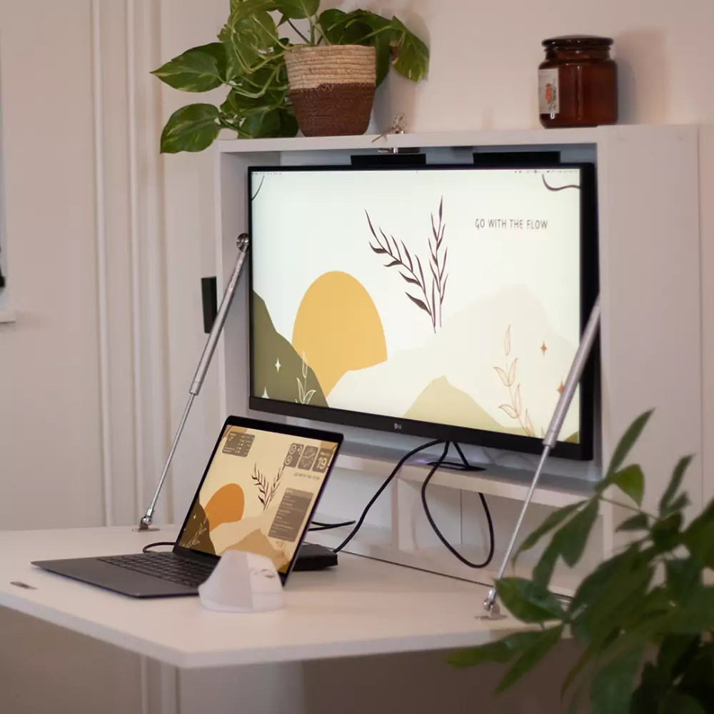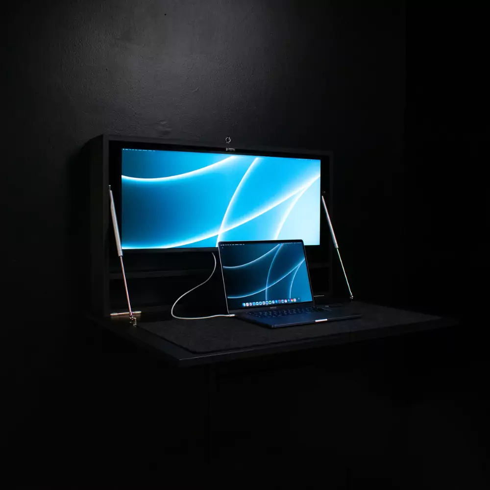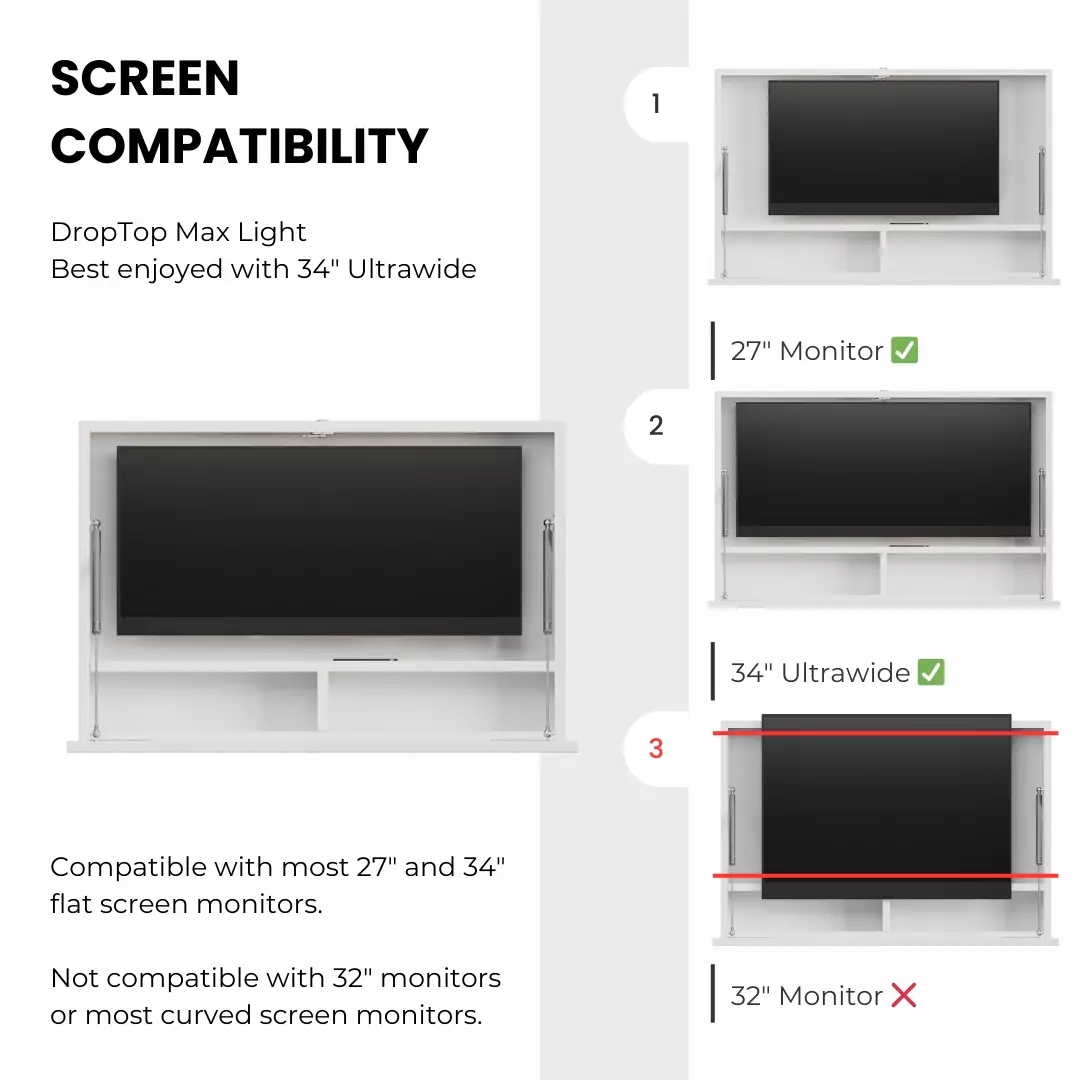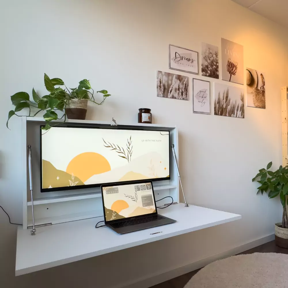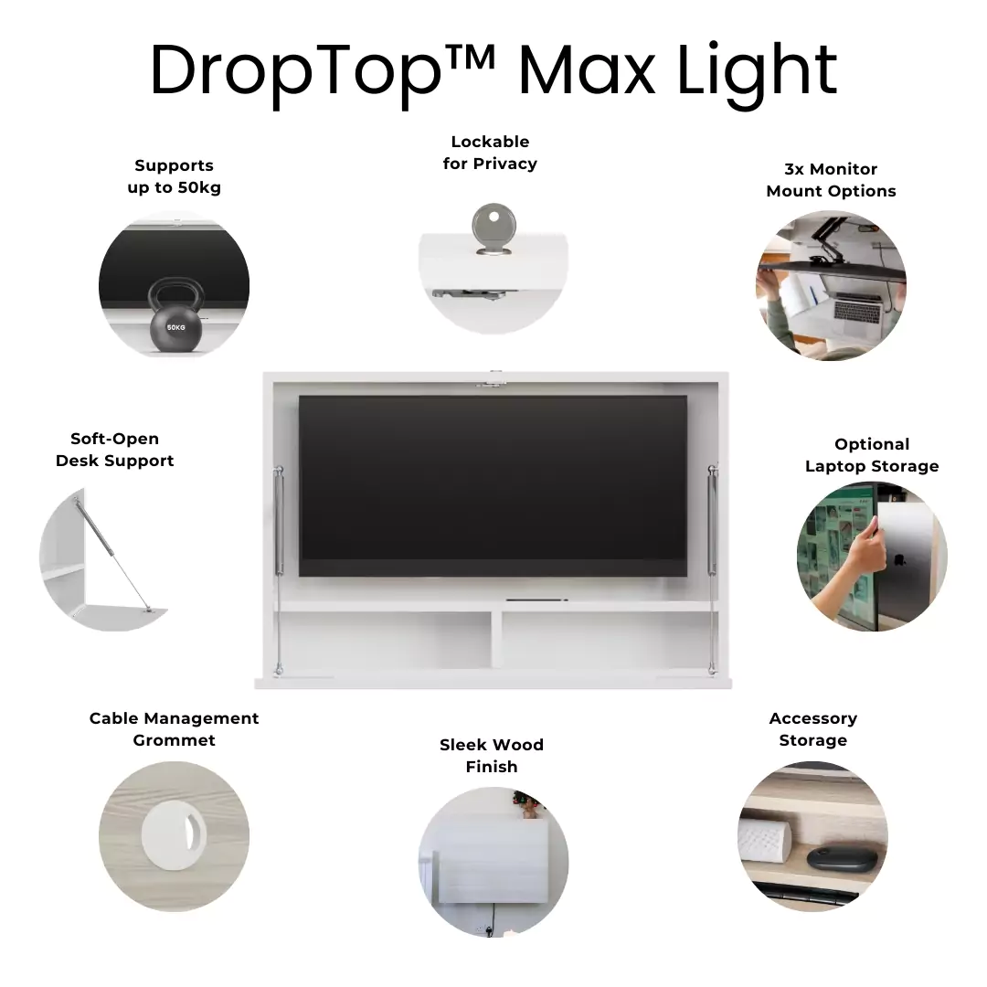 The DropTop Max Light is the perfect companion for the modern day creative. The innovative dropdown desk can accommodate either a 27 or 34-inch ultrawide monitor, making it the perfect dropdown desk for artistic pursuits. This dropdown desk is for homeworkers looking to reclaim their work-life balance. Transform a bedroom into a dual use space with DropTop. Gone are the days of the long commute. Simply open your desk, turn it on and away you go! Arriving flat packed for easy home assembly, this desk comes in five colour options, with a choice of monitor mounts. Why not opt for the extendable monitor mount for that extra flexibility, and to enable you to store your laptop behind the screen. Choose the Premium White colour option for a sleek matt finish, or if you prefer the look of natural wood grain, then the other colour options boast this timeless look for your new dropdown desk.